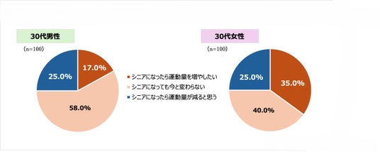 そこで、現在の働き盛り世代に、将来の意向や考えを聞いてみると、「ウォーキング」(Q2トップ回答)など健康意識の高い30代男性58.0%が「シニアになっても今と変わらない」と回答。反対に、今の運動量に64.0%が不満を抱いている30代女性は「シニアになったら運動量を増やしたい」と35.0%がポジティブな考えを持っていました。