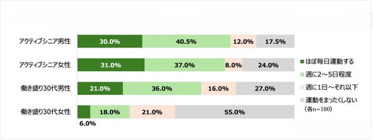 よりアクティブな活動に関し、シニア世代の3割強(男性30.0%、女性31.0%)が「ほぼ毎日」運動すると回答し、「1週間に2日以上」運動するシニアは男性70.5%、女性68.0%にも上りました。働き盛り30代男性も「1週間に2日以上」運動する方は過半数の57.0%ですが、30代女性は24.0%とここでも低い数値になりました。