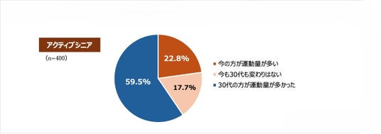 運動や健康を意識した活動にいそしみ、満足度の高い60~80代のアクティブシニアですが、ご自身が働き盛り30代だった頃と比較してもらうと、意外にも6割(59.5%)の方が「30代の方が運動量が多かった」と回答しています。