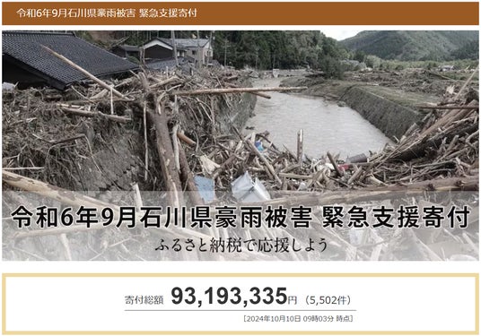 ふるさと納税ポータルサイト「さとふる」を運営する株式会社さとふる(本社:東京都中央区、代表取締役社長 兼 CEO:藤井 宏明)は、2024年9月24日に開設した「令和6年9月石川県豪雨被害 緊急支援寄付サイト」にて、10月10日より新たに愛媛県内7自治体による石川県輪島市、能登町への「代理寄付」の受け付けを開始します。これにより本サイトで支援する被災自治体数は4自治体、寄付受け付け自治体数は22自治体となります。なお、本サイトを通した寄付総額は、10月10日午前9時時点で9,300万円以上になりました。各自治体に集まっている寄付総額などの最新情報は、「令和6年9月石川県豪雨被害緊急支援寄付サイト」に記載しています。