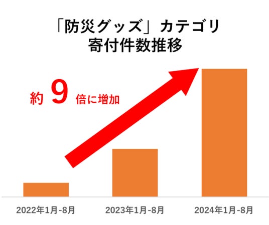 「さとふる」の「防災グッズ」カテゴリお礼品への2024年1月から8月の寄付件数は、前年同期比で約2.7倍に増加しました。2年前の同期間と比較すると約9倍に増加しており、年々さまざまな災害が発生する中で、防災意識の高まりが関連お礼品への寄付件数の増加につながっていると推察されます。