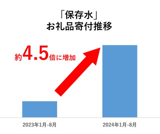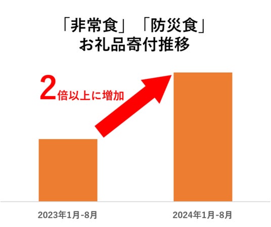 特に、「非常食」および「防災食」がタイトルにつくお礼品への同期間の寄付件数は前年同期比2倍以上に、「防災用トイレ」関連お礼品(※)への寄付件数は前年同期比12倍以上に増加したほか、「保存水」お礼品への寄付件数は前年同期比で約4.5倍に増加しました。なお、「保存水」お礼品への2024年1月単月の寄付件数は前年比11倍以上、8月単月では前年比で約9倍と大きく増加しており、能登半島地震の発生や「南海トラフ地震臨時情報」の発表を受けて、防災関連のお礼品を選んだ方が急増したことがうかがえます。