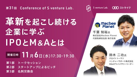 M&A仲介の株式会社ストライク(本社: 東京都千代田区、代表取締役社長: 荒井邦彦 以下「ストライク」)は、スタートアップ企業と事業会社の提携促進を目的としたサービス「S venture Lab.」を運営しており、その一環として、2024年11月6日(水)に、仙台市が実施する「Sendai Startup Studio INNOVATOR’S MEETUP」と共催でセミナー「革新を起こし続ける企業に学ぶIPOとM&Aとは」を、仙台スタートアップスタジオ(宮城県仙台市)とオンラインで同時開催いたします。