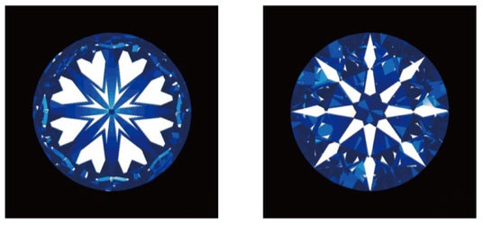 高い技術により極めて精巧にカットされ、完璧なファセット(カット面)のシンメトリーを実現したダイヤモンドは、上からると8本の矢、下から見るとハートのような模様を見ることができます。これはハート&キューピッドと呼ばれ、完璧な対称性を持つダイヤモンドの証です。8つのハートを8つの矢が貫く、神秘的でロマンティックなシンボルがダイヤモンドに現れます。