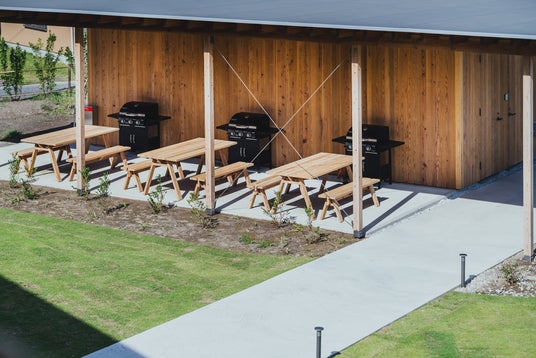 共用のBBQスペース。ベンチやテーブルも芦沢氏がデザインし、地元千葉県産山武杉を使用して制作。