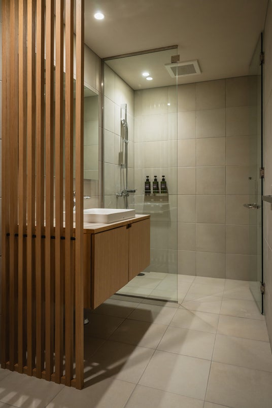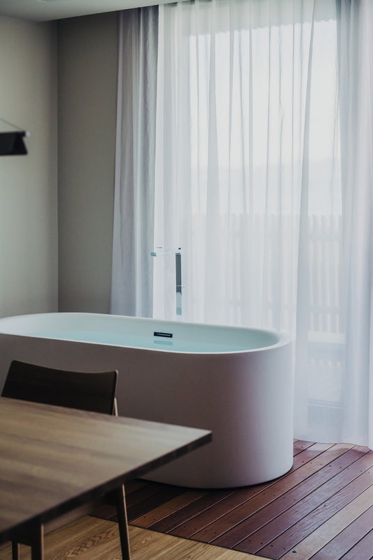 自然と空間の関係性に“遊び”を持たせるバスタブが特徴的な空間(*館山1stのみ)。海風を感じながら、身体をゆるめるインナーバスとして設置。