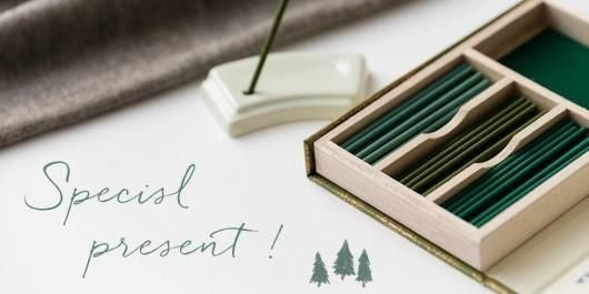 旅先のワンマイルウェアにぴったりなフォレストグレイシリーズの販売を記念して、期間中にフォレストグレイシリーズの9アイテムを含む税込44,000円以上のお買い上げをいただいた方へ、トラベルや出張先にも持ち運びやすい「日本香堂/お香 森の香スティック」をプレゼントいたします。
