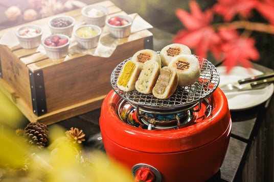 芋栗かぼちゃのおやき3つに、マスカットをはじめとする秋のフルーツやチョコレート、クリームチーズなどのトッピング6種が付いた「BEBスイーツおやきセット」を販売します。自分でおやきを温めて、好きなトッピングを挟んでオリジナルのおやきを楽しむことができます。自分好みのスイーツおやきを作るもよし!仲間とシェアして、色々な味を試すもよし!秋の風を感じる中庭で食べるのがおすすめです。