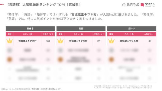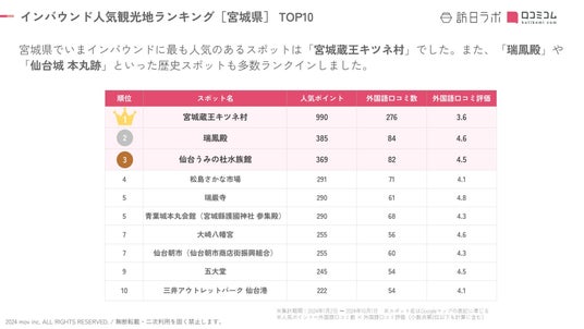 - 調査対象:訪日ラボが独自に選出した宮城県の観光スポット 2,640箇所