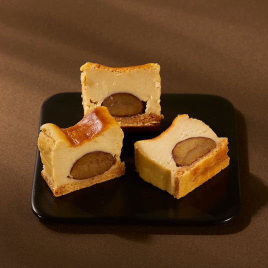 クッキー生地の上にまるごとの栗をぎっしりと並べ、北海道産のクリームチーズと茨城県産「利平栗」のペーストを使用したチーズケーキを流し込み、じっくりと焼き上げました。