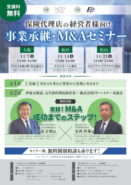 中之島キャピタル株式会社(本社:大阪市北区中之島、代表取締役社長:徳永洋亮)は、株式会社FP パートナーとの共催で『保険代理店経営者向け』事業承継・M&Aセミナーを開催いたします。