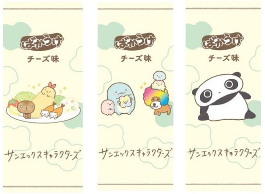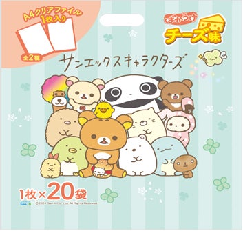 たれぱんだ・リラックマ・すみっコぐらしたちがパッケージに登場、2種類のオリジナルクリアファイルの内いずれか1枚入っており、中身のおせんべいは、みんなに人気のチーズ味のソフトせんべいです。