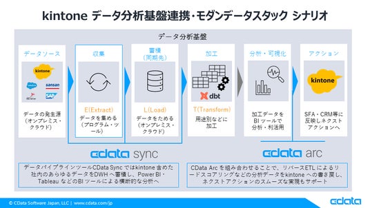 ノーコードのデータパイプラインツールCData Sync ではkintone を含む社内のあらゆるデータをDWH へ蓄積し、Power BI・Tableau などのBI ツールによる横断的かつスピーディな分析につなげることが可能です。さらにCData Arc を組み合わせることで、リバースETL によるリードスコアリングなどの集計結果・分析データのkintone への書き戻し、現場へのスムーズなネクストアクションを促します。