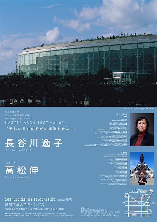 京都精華大学(京都市左京区、学長:澤田 昌人)では、デザイン学部建築学科が主催する講演会シリーズ「MASTER ARCHITECT」に、建築家の長谷川逸子氏をお招きして、講演会「新しい共在の時代の建築を求めて」を開催します。