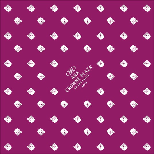 柔らかく手触りのいい布地に秋田犬のイラストとホテルロゴをプリントし、鮮やかなプラムカラーで仕上げました。