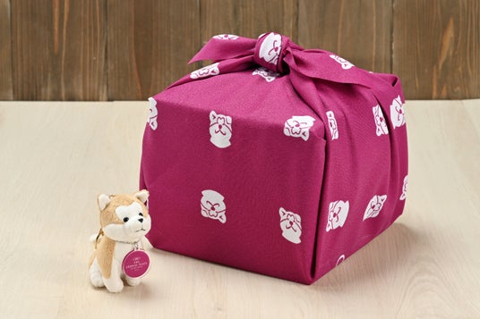 秋田犬のオリジナル風呂敷に包んで、マスコットキーホルダーとご一緒にお届け