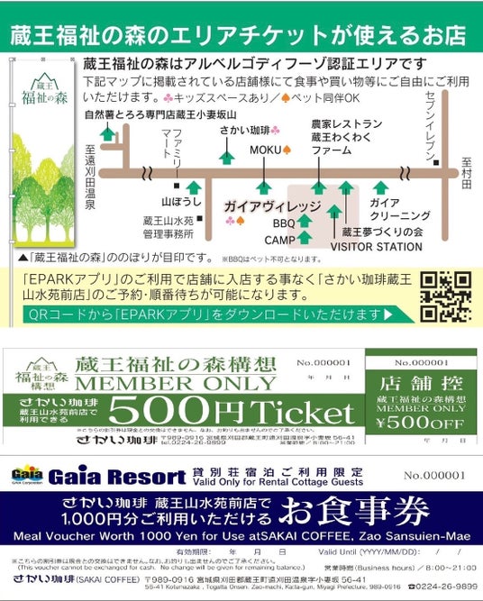 エリア内宿泊施設滞在者に発行されるチケットと域内グループ企業の福利厚生チケット及びエリアマップ