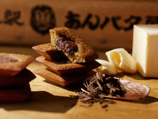 その奥ゆかしい香ばしさが『あんバタ』の旨みを存分に引き立てる。『ほうじ茶』と丁寧に焦がしたバターを練り込んだフィナンシェ生地で、岡田謹製、希少な北海道千歳産『えりも小豆』餡子を包み込んだ。『あんバタ』を引き立てる『ほうじ茶』の神業を篤とご覧あれ。