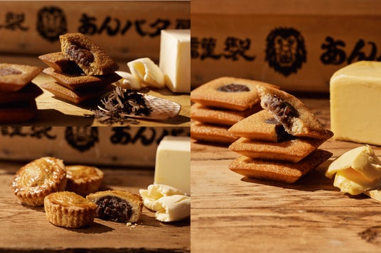 画像左上:あんバタフィナンシェ ほうじ茶、画像左下:あんバタガレット、画像右:あんバタフィナンシェ