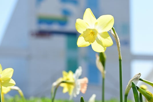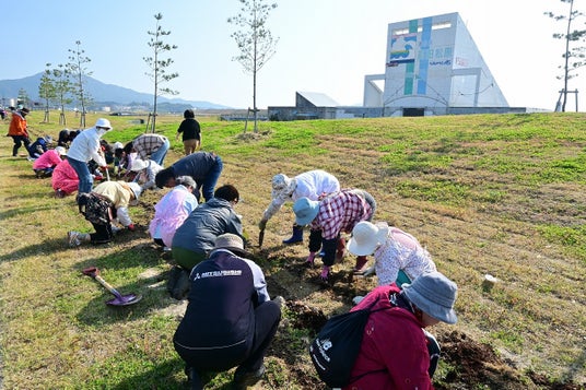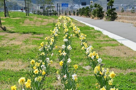 岩手県立高田松原津波復興祈念公園では、11月4日(月・祝)に市民協働で震災遺構「タピック45」の国道45号側にスイセンの球根を植栽します。3年目となる取り組みで、4月には約200mの花の道が行きかう人の目を楽しませてくれました。今年は、国営ひたち海浜公園から3,000球の提供を受け実施。歩道と震災遺構の間の築山の一部を、希望の象徴「スイセン」の花で彩ります。