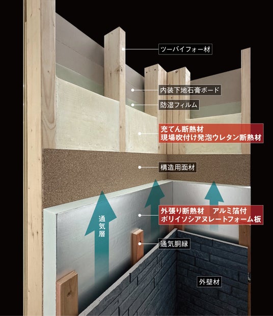 断熱仕様: W断熱工法(充てん断熱材:現場吹付け発泡ウレタン断熱材、外張り断熱材:アルミ箔付きポリイソシアヌレートフォーム板)