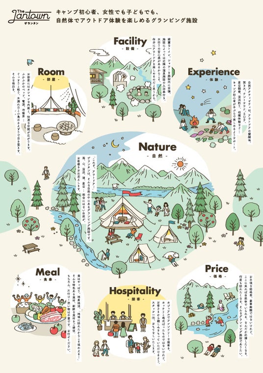 『キャンプ初心者、女性でも子どもでも、自然体でアウトドア体験を楽しめるグランピング施設』をコンセプトに、水回りの清潔さや、地産地消の食事など「ちょっとずつのこだわり」を、施設の随所にちりばめた企画・運営を行っています。