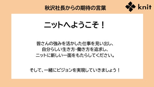 その後、代表の秋沢から新しく入社したメンバーへ向け、ジョインしてくれたことへの感謝が述べられました。これから、自分らしい働き方を追求しながら、組織に新しいシナジーをもたらしてくれることへの期待が伝えられました。