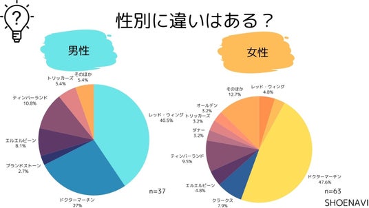 男性はレッドウィングが1位、ドクターマーチンが2位に対して、女性は1位がドクターマーチン、2位はそのほかとなり、男女に差がある結果となりました。女性はUGGやDIANAなどのブランドがあるため、男性とは異なる結果となっています。