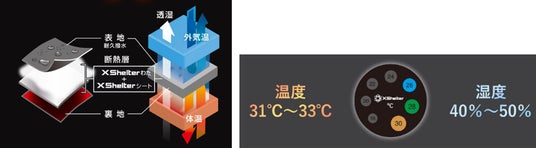 (左)断熱シート×吸光発熱わた (右)衣服内の快適温度:衣服内の環境が温度31℃~33℃、湿度40%~50%の場合、もっとも快適と言われています