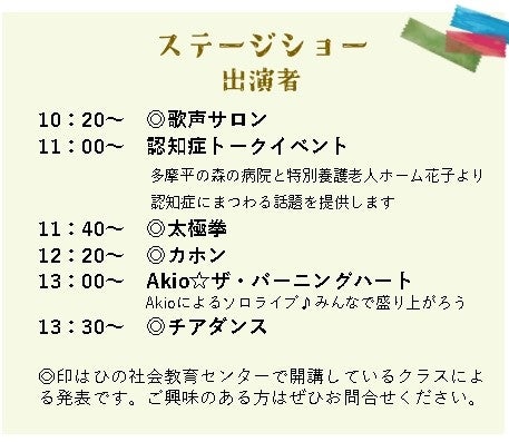 ステージエリアでは歌や楽器、ダンスや認知症トークイベントなどの発表・ショーが行われます。近くに休憩コーナーもありますので、ゆっくりご覧になってください。