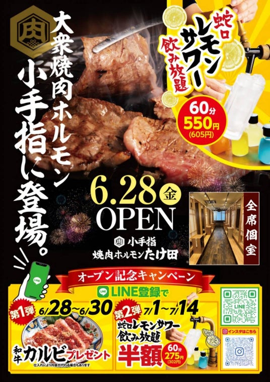 『日常価格でごちそう体験を』最高ランクA5黒毛和牛カルビや炊きたて土鍋ごはんなど、普段づかいでありながら上質な食体験をお値打ち価格で楽しめる焼肉ブランド「焼肉ホルモンたけ田」を運営する株式会社ミナモト(代表取締役:細田源太)は、西武線沿線内でのグループ焼肉店10店舗目となる『焼肉ホルモンたけ田 小手指店』を2024年6月28日にグランドオープンいたします。また、オープンに合わせて名物 「蛇口レモンサワー飲み放題」が半額や黒毛和牛A5カルビが無料になるキャンペーンも同時に開催いたします。