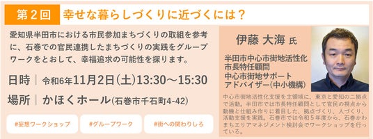 第1回では、全国各地でまちづくりに携わっている専門家をお招きし、一人ひとりが楽しく暮らせる地域づくりを行っている先進事例を紹介いただく勉強会を開催します。第2回では、ワークショップを通して参加者の皆さん同士のアイデアや理想の暮らし方を共有し、実現に向けたアクションを考えます。