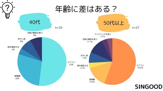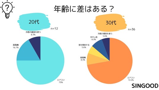 年齢別に差を見てみると、20代はエアコンを使っている人が多く、40代はエアコンと扇風機で80%という結果になっています。