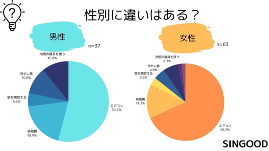 男女で「暑い日、快眠するために使っている方法」をまとめてみると、女性はエアコンを使う人が多い結果となりました。男性はエアコンが多いですが、扇風機や冷感の寝具を使う人もいてバランスよく使っている感じです。