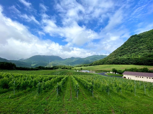 了美ヴィンヤード&ワイナリーは、宮城県黒川郡大和町吉田地区にあるなだらかな丘の上に2017年にオープン。赤崩山のふもとに位置する牧草地採取の跡地を利用して、2016年からぶどう畑に定植を開始。2017年には醸造所を整備して自社醸造を開始、2020年にレストラン「了美 wine & dine」と宿泊棟「Retreat了美七ツ森」をオープンしました。晴れた日には七ツ森の山々や遠く広がる仙台平野まで見渡せる眺望、そして船形山系と泉ヶ岳が交差する山の稜線には四季折々の表情を一年中楽しんでいただけます。仙台から車で1時間弱程で、まるで異国を思わせる自然豊かな風景が広がっているのが魅力です。現在、日本ワインを40,000本製造しています。