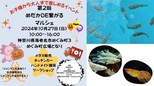 「ビオトープやアクアリウムでのメダカの飼育の楽しさを皆さんに広めたい。海老名工場で養殖している改良メダカのことをもっと知っていただきたい」との思いで初出店した第1回のマルシェには、メダカ愛好家の皆さまをはじめ、休日のご家族連れのお客さまで大いに賑わいました。今回は前回よりも11店多い28店舗のメダカ販売店のほか、ハンドメイド雑貨とワークショップ6店、キッチンカー5台が出店。お子さま向けのじゃんけん大会や出張接骨院など、秋のさわやかな休日に楽しんでいただける内容が盛りだくさんです。
