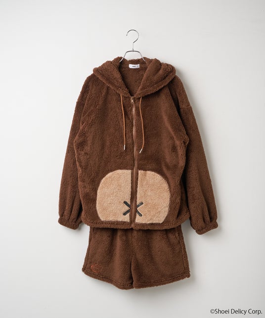 今回発売となる第2弾コラボレーションアイテムは、柔らかく、もこもこした着心地の良い生地を使用したZIPパーカーとショートパンツがセットになった、誰でも着るだけで「チョコジロー」になれるルームウェアを展開。セットアップとしてはもちろん、単体でも着用いただけるアイテムとなっております。