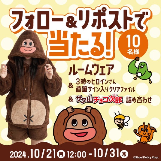 さらに、コラボレーションアイテムの販売開始に合わせ、10名様限定でサク山チョコ次郎コラボルームウェアと3時のヒロイン直筆サイン入りクリアファイル、『サク山チョコ次郎』商品詰め合わせが当たるキャンペーンも実施致します。