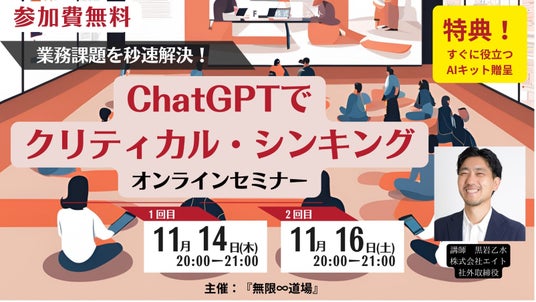 『無限∞道場』を運営する株式会社エイト(本社:東京都渋谷区、代表取締役:森田晋也、以下「エイト」)では、AIを活用した業務効率化とクリティカル・シンキングを学べるオンラインセミナー『ChatGPTでクリティカル・シンキング』を開催します。本セミナーは、業務改善にAIを導入したいが、効果的な使い方がわからない方や、DX(デジタルトランスフォーメーション)人材を目指す方に向けた、実践的な内容となっています。