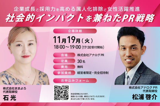 「企業の情報と印象をデザインする」をコンセプトに掲げ、メディアとWEBとオフラインを融合させたマーケティング戦略を提供する、株式会社アナログPR(本社:東京都港区、代表取締役:松浦啓介)は2024年11月19日(火)に、ひとり親の仕事創出と企業の人材不足を解決するアウトソーシングサービス「ままよろ」を提供する、株式会社ままよろ(本社:東京都渋谷区、代表取締役:石 光)とコラボセミナーを開催することをお知らせいたします。