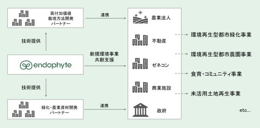 エンドファイトは、これまで10社を超える大手企業と植物の栽培方法の開発や緑化・農業資材の開発を行っており、広いネットワークを構築するとともに、広い分野での技術の実証化が期待されます。今後は、エンドファイトの共同実証ネットワークや成果物を組み合わせ、不動産やゼネコン、商業施設等のインフラ関連の企業へ新たなグリーン領域の新規事業共創支援を行い、環境分野の新規事業共創のエコシステムの中核を担うプレイヤーとなるとともにグリーン領域における事業インパクトの最大化を目指してまいります。