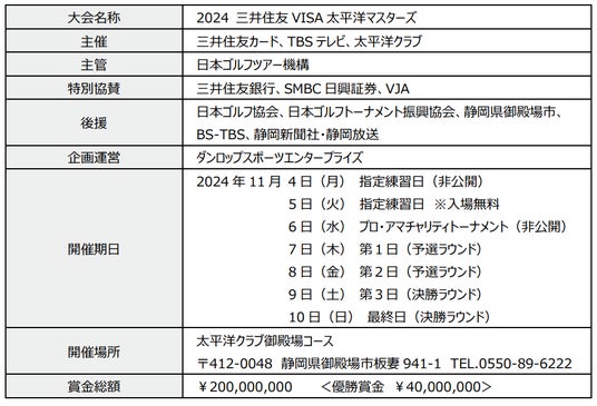 三井住友カード株式会社(本社:東京都江東区/代表取締役社長:大西 幸彦)、株式会社TBSテレビ(本社:東京都港区/社長:龍宝 正峰)、株式会社太平洋クラブ(本社:東京都千代田区/社長:韓 俊)の3社は、2024年11月7日(木)から10日(日)の4日間、太平洋クラブ御殿場コース(静岡県御殿場市)にて一般社団法人日本ゴルフツアー機構主管のもと「2024 三井住友VISA太平洋マスターズ」を開催いたします。