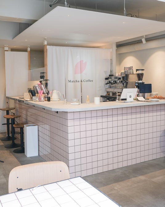 ピンクのタイルを使った唯一無二の空間に、自家焙煎のコーヒー、自家製の焼き菓子と、オーナーが京都など個別の茶農家まで直接出向いて仕入れている最高品質の抹茶の提供が特徴。
