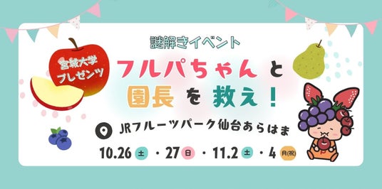 仙台ターミナルビル株式会社(本社:仙台市、代表取締役社長:松崎哲士郎)が運営するJRフルーツパーク仙台あらはま(所在地:仙台市若林区荒浜新2丁目17-1/以下、フルーツパーク)において宮城大学(所在地:黒川郡、学長:佐々木 啓一)と連携し、オリジナル謎解きイベント「宮城大学プレゼンツ フルパちゃんと園長を救え!」を開催いたします。
