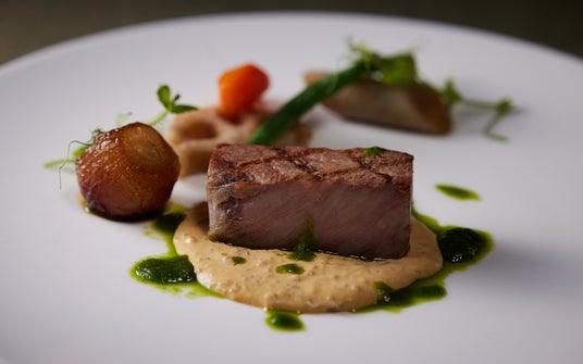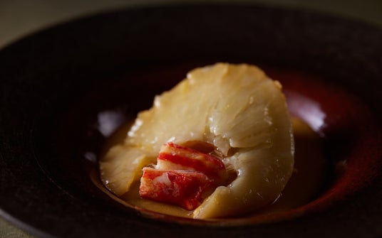 - 活〆鮟鱇とその肝を使った海のロッシーニ 人参のクリームとトリュフソース