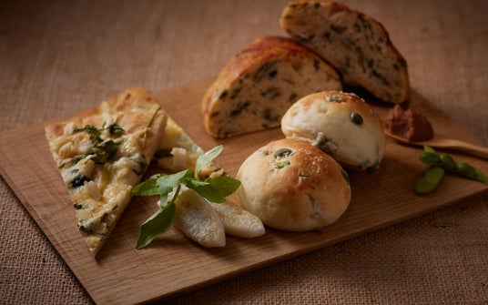 左/笹かまぼことセリのピッツァ 右上/三陸わかめと仙台味噌のリュスティック 右下/宮城枝豆のずんだあんパン