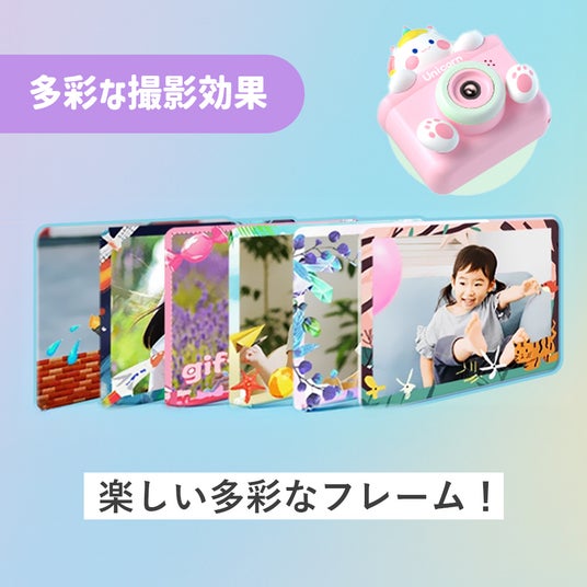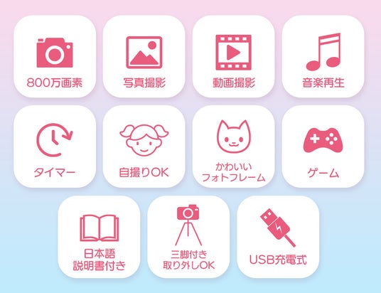 三脚付きで、写真や動画、自撮りがキレイに撮影できるカメラです。音楽再生やゲームなど楽しい機能も充実し、こどもの知的好奇心を育みます。