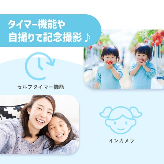 セルフタイマー機能でお友達や家族と記念撮影や、インカメラで自撮りもできます。3倍ズーム機能付き。