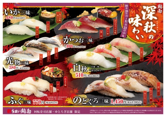 秋真っただ中、まだ食べていない秋のネタはありませんか?うまい鮨勘では、回転寿司店舗・ゆとろぎ店舗、東北対面寿司店舗それぞれの業態で「深秋の味わい」と題して食欲の秋に嬉しい様々なネタをご用意!
