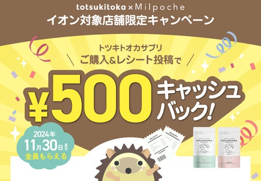 妊活サポートアプリ「konotoki」や妊娠記録アプリ「totsukitoka」を運営するアマネファクトリー株式会社(本社所在地:東京都渋谷区 代表取締役 齊藤慶武)が出産内祝いのギフトサイト「Milpoche」を運営する株式会社メリックス(本社所在地:大阪市北区 代表取締役社長 豊饒賢造)とともに販売中のトツキトオカサプリメントシリーズがイオン店頭に新登場!販売開始記念として、キャッシュバックキャンペーンを実施中です。